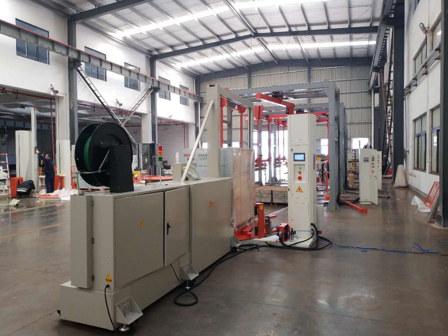將托盤(pán)貨物放到纏繞機(jī)圓盤(pán)上后,按啟動(dòng)鍵進(jìn)行全自動(dòng)打包(縱橫2條行程井字形,共計(jì)4條)打包好后進(jìn)行托盤(pán)纏繞,自動(dòng)纏繞包裝好后會(huì)有報(bào)警提示音人工用叉車(chē)下貨入庫(kù)完成整個(gè)流程。